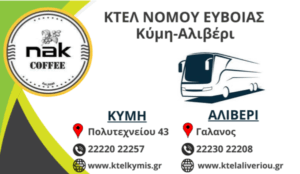 Δευτέρα έως Παρασκευή Κύμη-Χαλκίδα-Αθήνα 06:30, 10:30, 13:00, 18:30 (Καλημεριάνοι-Καλλιανοί-Πύργος-Ανδρωνιανοι-Ταξιάρχες-Κονίστρα-Διρρεύματα-Μονόδρι-Αυλωνάρι-Λοφίσκος-Δάφνη-Νεοχώρι-Λέπουρα-Αλιβέρι) Αθήνα-Χαλκίδα-Κύμη 11:00, 14:00, 17:00 Αλιβέρι-Χαλκίδα-Αθήνα 05:45,06:45,07:45,08:45,09:45,10:45,11:45,14:10,15:45,17:45,19:45 Χαλκίδα-Αλιβέρι 07:00,09:15,10:15,12:15,13:15,15:15,16:15,18:15,20:15 Αλιβέρι-Κάρυστος 14:15 Κάρυστος-Αλιβέρι ...
